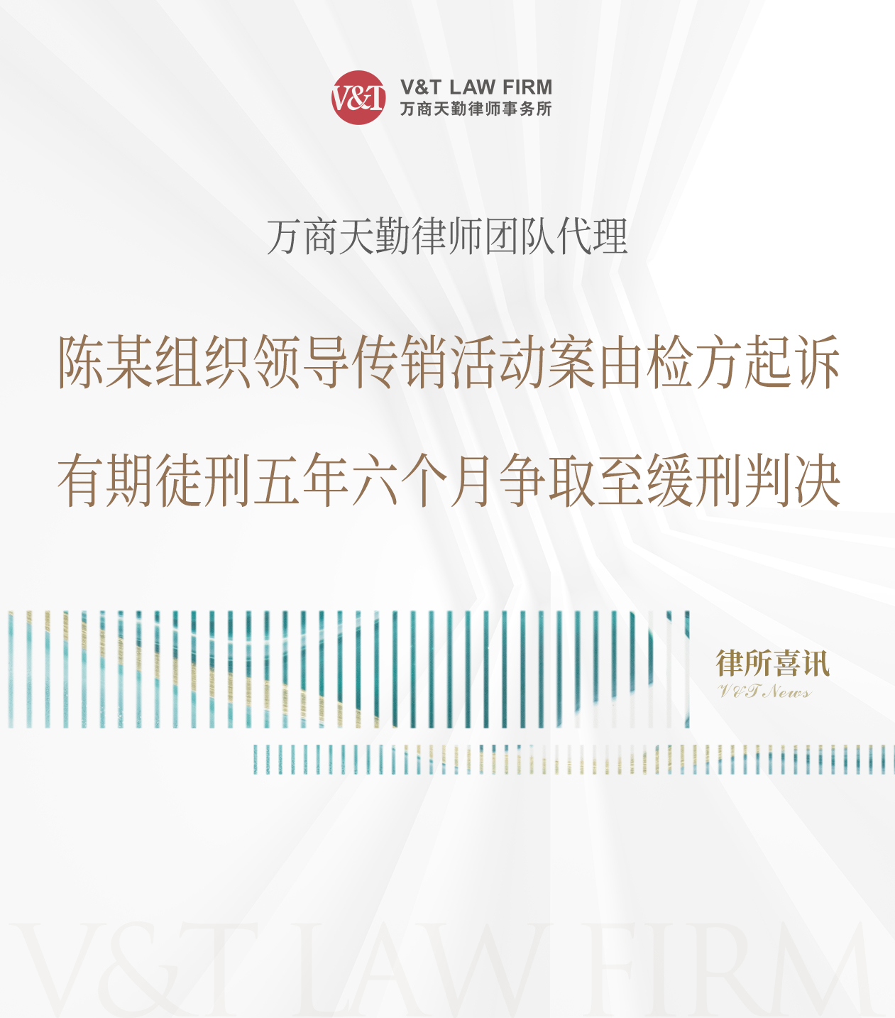 陈某等人涉嫌组织领导传销活动罪一案,陈某案发时已成为传销组织的第四层级,在涉案六名嫌疑人中排序第二,其涉嫌“在传销活动中承担管理协调、宣传培训等职责”,参与传销资金超2000万元。因该案在当地具有重大影响,陈某经检察院批捕被羁押在案。万商天勤广州办公室在陈某逮捕后接受家属委托,指派蒋珊珊律师担任陈某的辩护人。接手案件后,辩护律师通过羁押必要性审查程序,成功在一周内为当事人争取到取保;后续在检察机关建议对陈某量刑五年六个月的情况下,通过有效辩护为当事人争取到判三缓五的判罚。